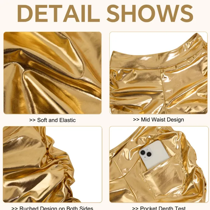 Feature: Shorts, metal coated fabric, with excellent elasticity, solid color, side ruched, v back design, with a pocket on the back for storing mobile phones and other items.