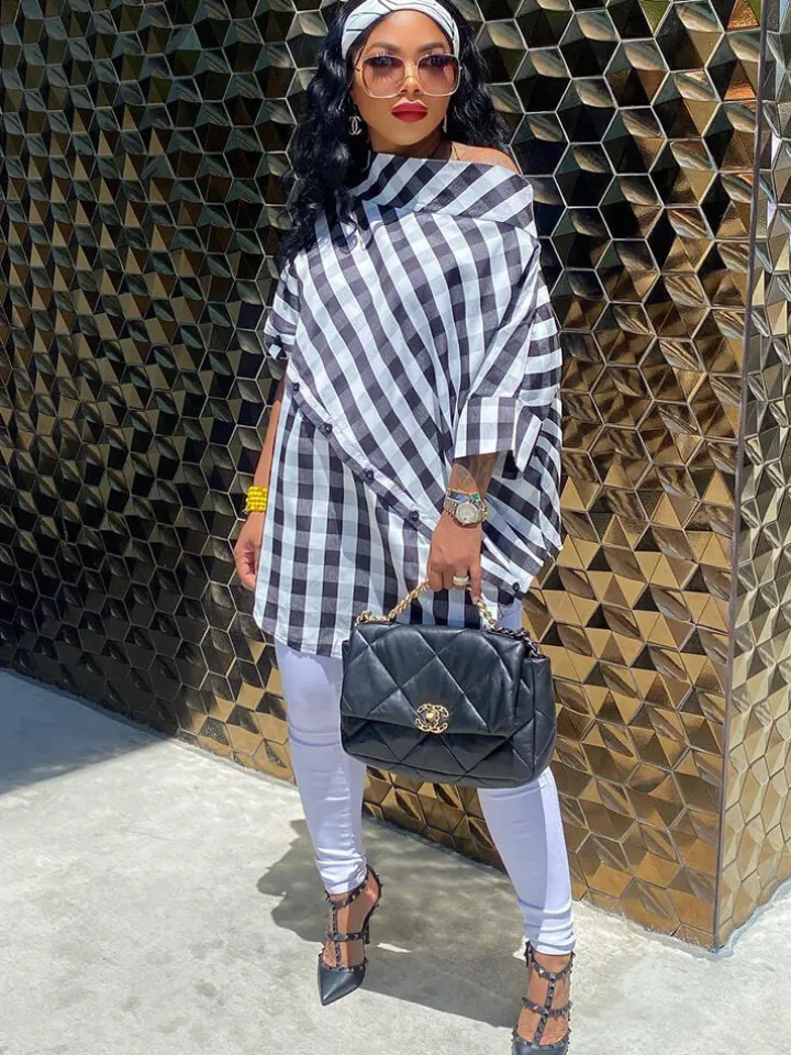 Feature: One-shoulder, asymmetrical, plaid print, half sleeve, long sleeve, casual, bodycon, tops.