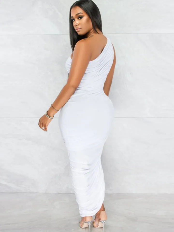 Features: High waist, ruched, one-shoulder, sleeveless, backless, solid color, sexy, bodycon, maxi dresses.