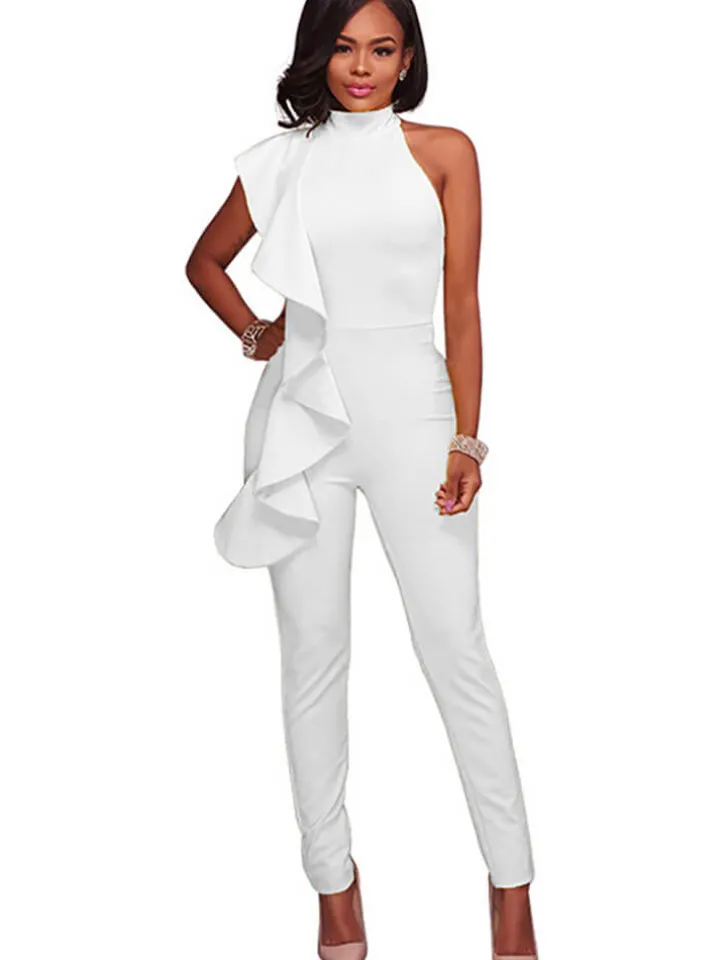 Feature: Sleeveless, solid color, one shoulder, ruffles, mock neck, casual, irregular, slim fit, bodycon, jumpsuit, zip-up.