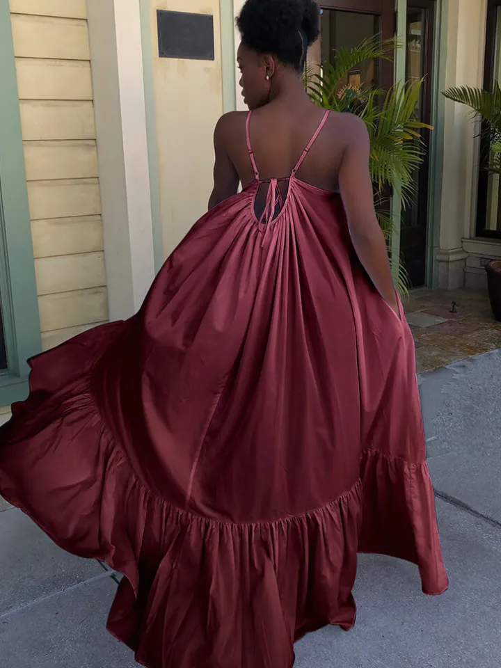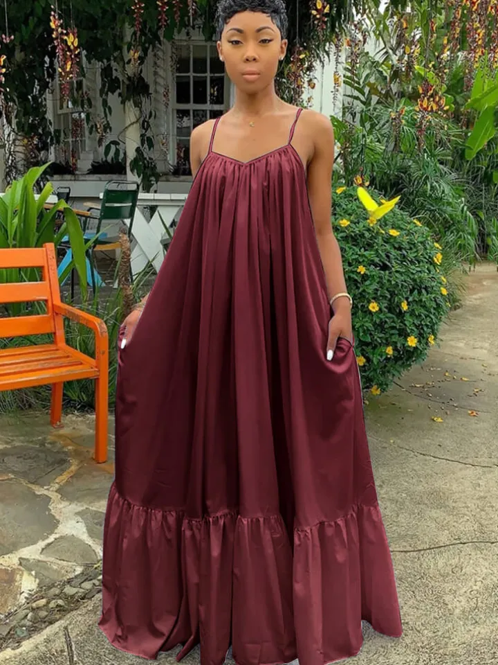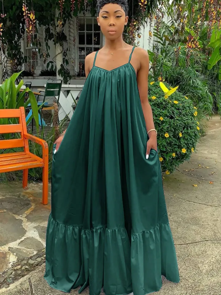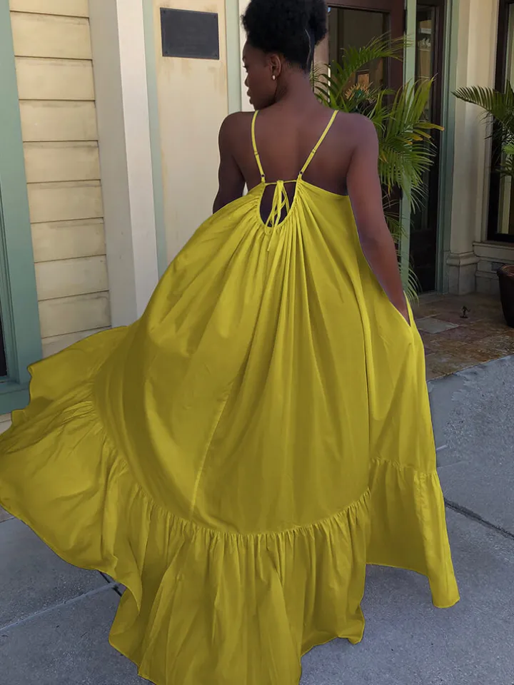 Features: Round neck, adjustable spaghetti strap, sleeveless, backless, bandage, plus size, with pockets, ruffle hem, solid color, large swing dresses, beach dress.