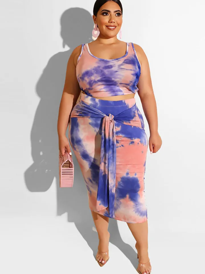 Feature: Two-piece outfits, plus size, sleeveless, crop top, tank top, tie-dyed print, high waist, bandage, midi dress.