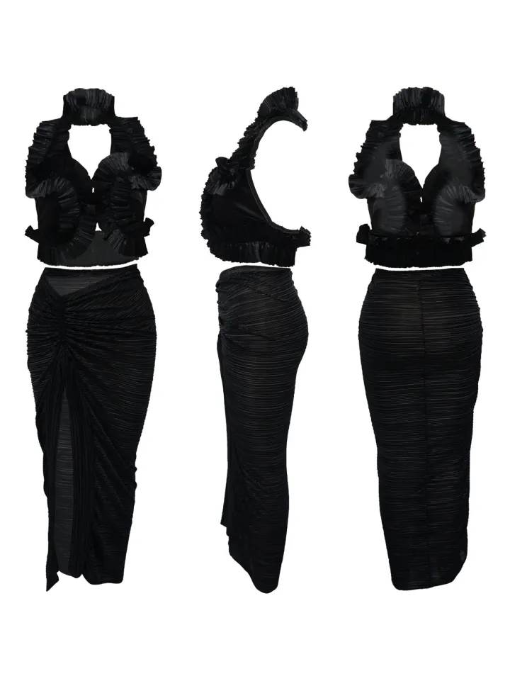 Ruffle Hem Top Ruched Slit Skirt Set
