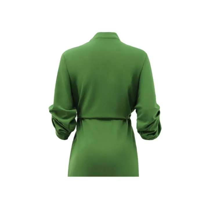 Features: Dress, v-neck, cinched waist, high waist, long sleeves, solid color, tie-up, pocket patch, loose.