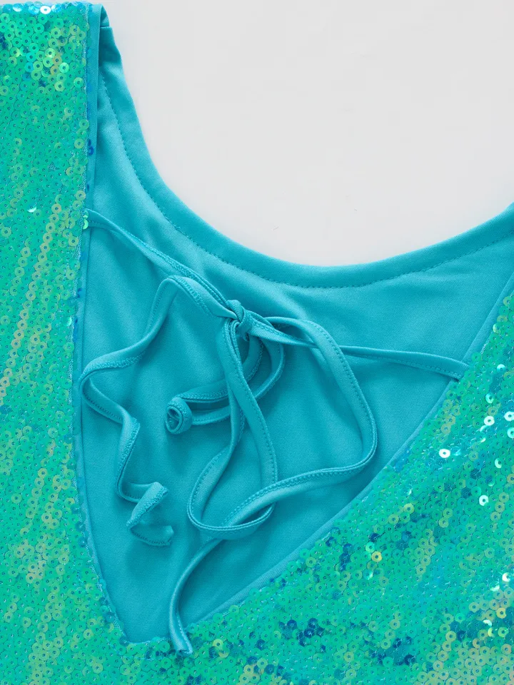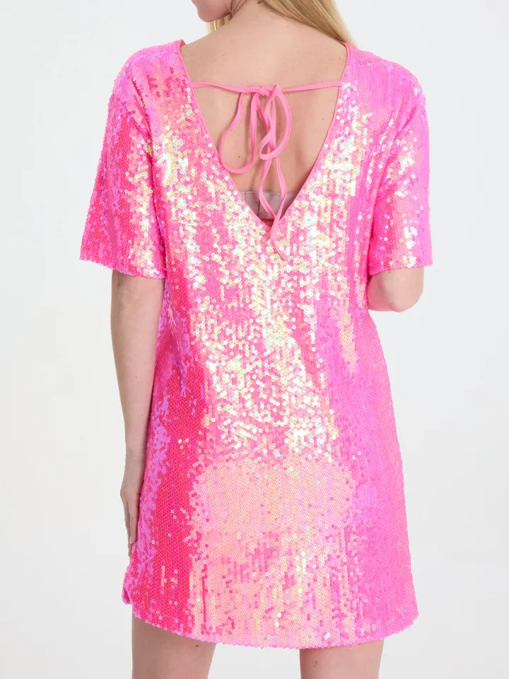 - Sexy backless design, tie back and V-shaped, crewneck, A-line, short sleeve t-shirt dress, colorful shiny sequin mini dresses.