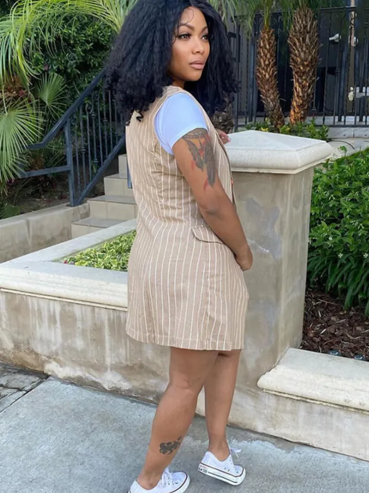 Feature: 2 piece blazer short sets outfits, jacket, sleeveless, stripes print, lapel V neck, button-down, short pants with belt, side pockets, casual business jumpsuit.