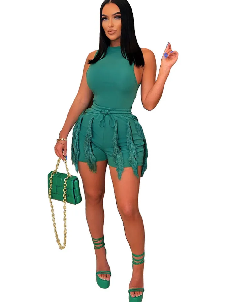 Features: Two-piece outfit, sleeveless, tank top, solid color, drawstring, elastic waist, tassels, short pants.