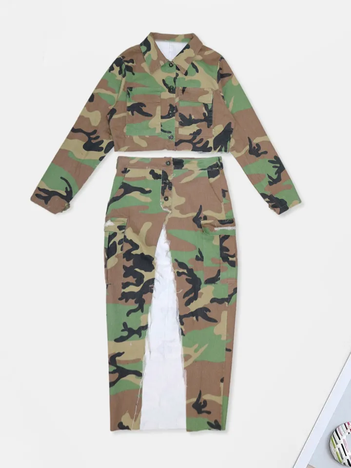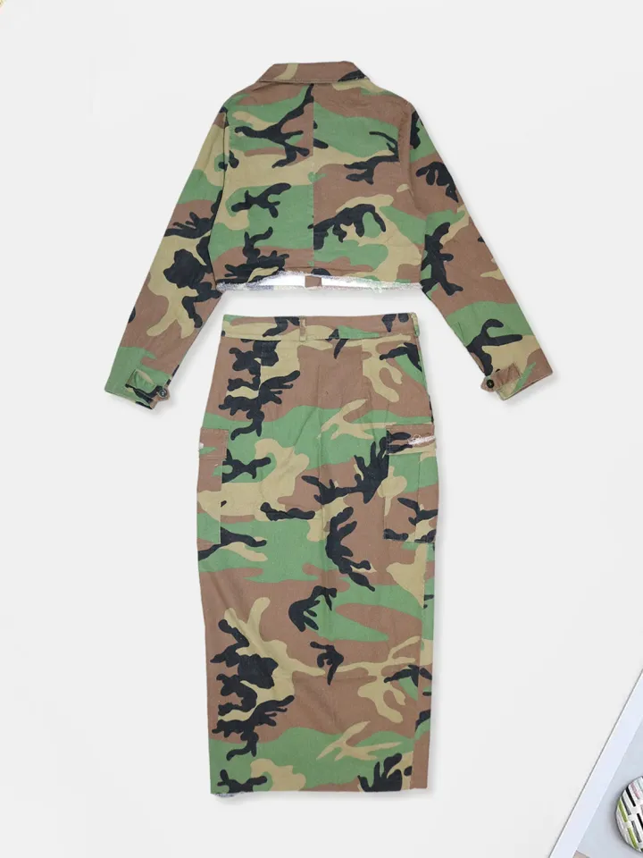Two-Piece Camouflage Print Long Sleeve Midi Skirt Set