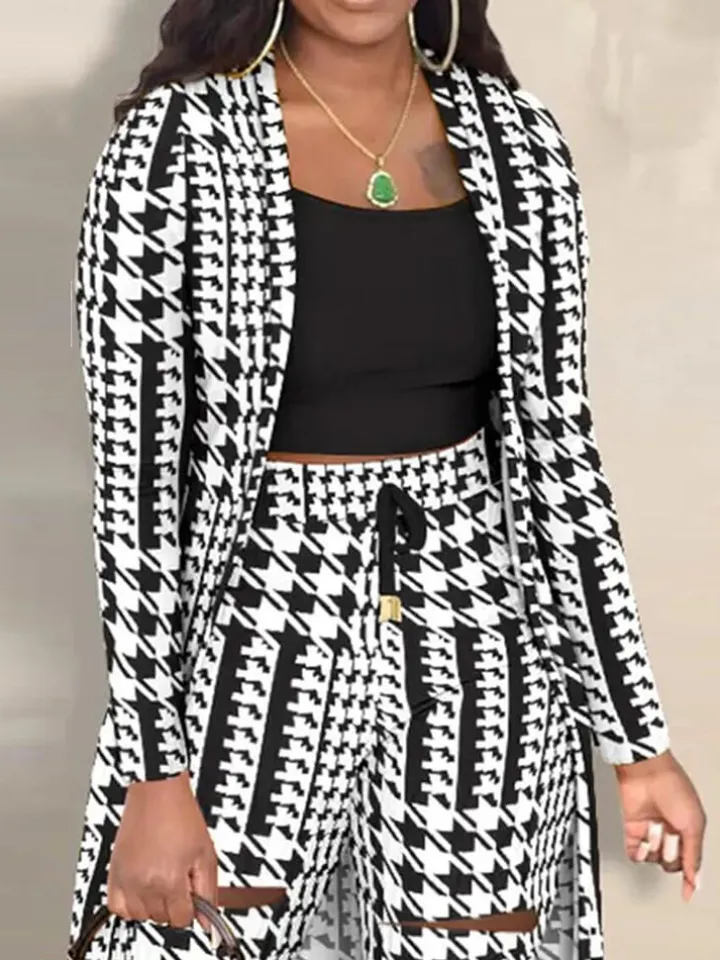 Feature: Houndstooth, printed, long sleeve, jackets, cardigans, drawstring, tie up, cut-out, pants suit, two-piece outfits.