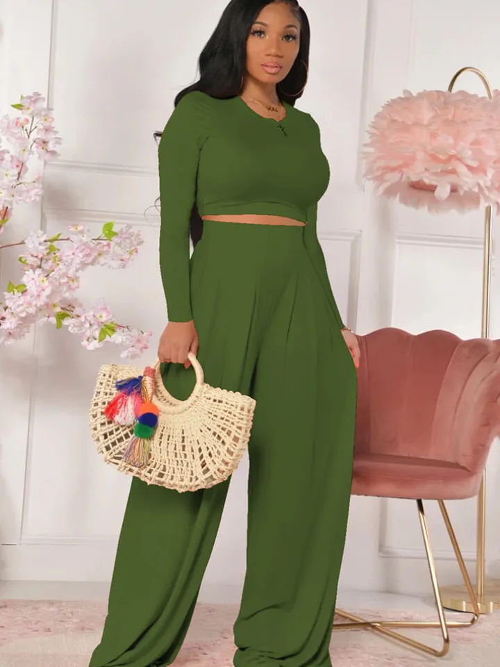 Two Piece Long Sleeve Crop Top Wide Leg Pants