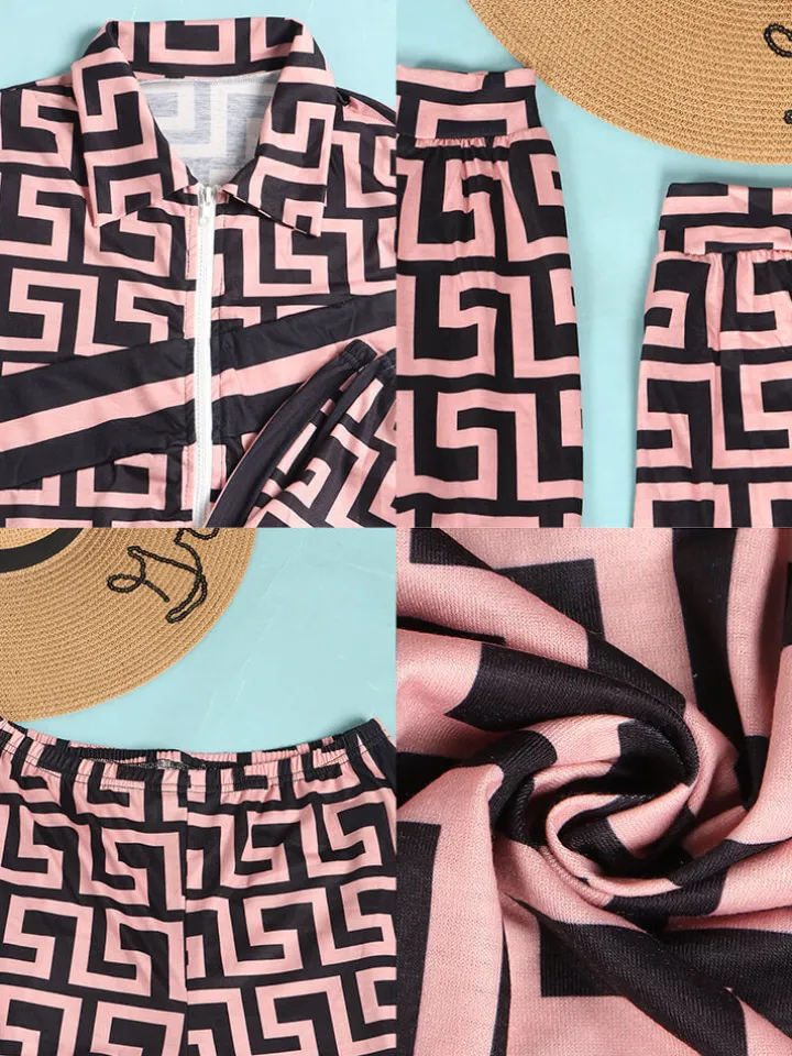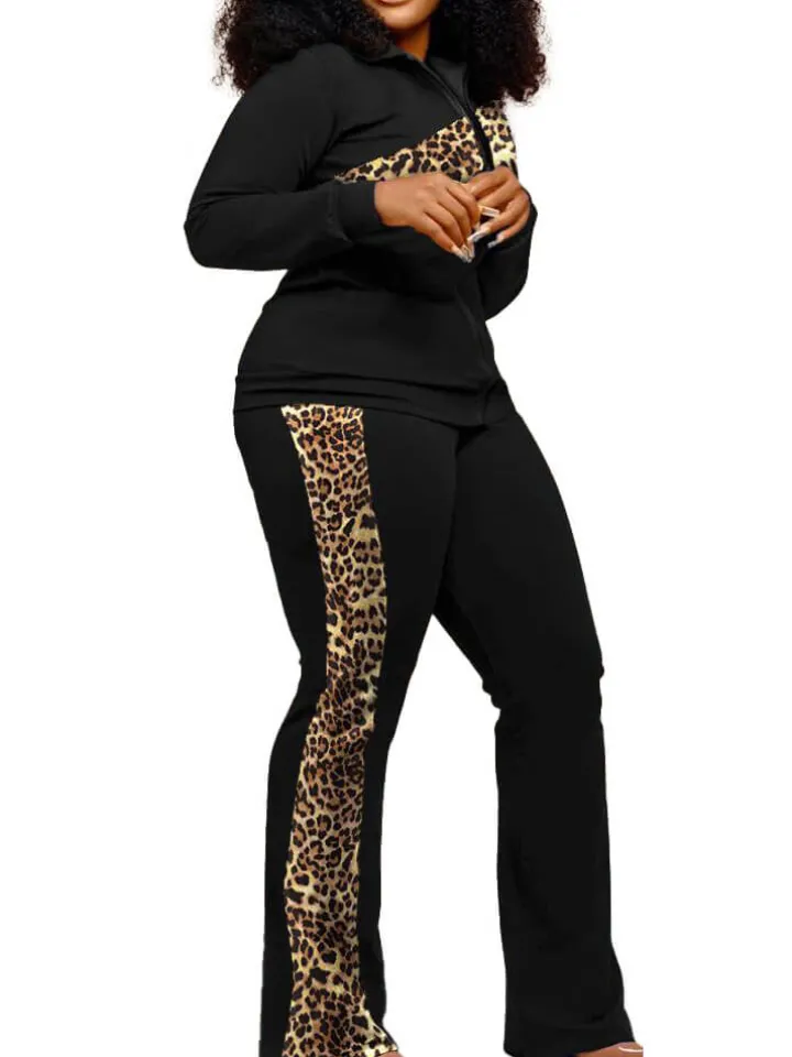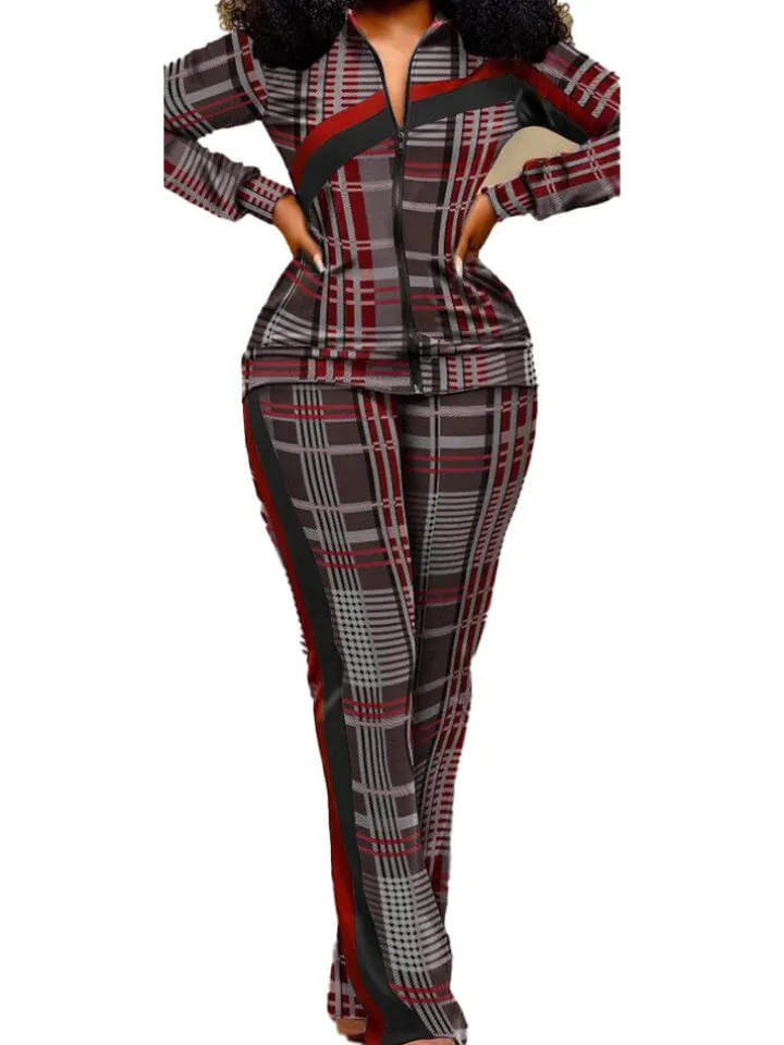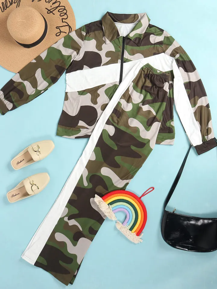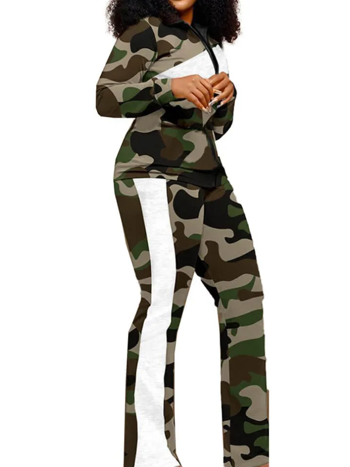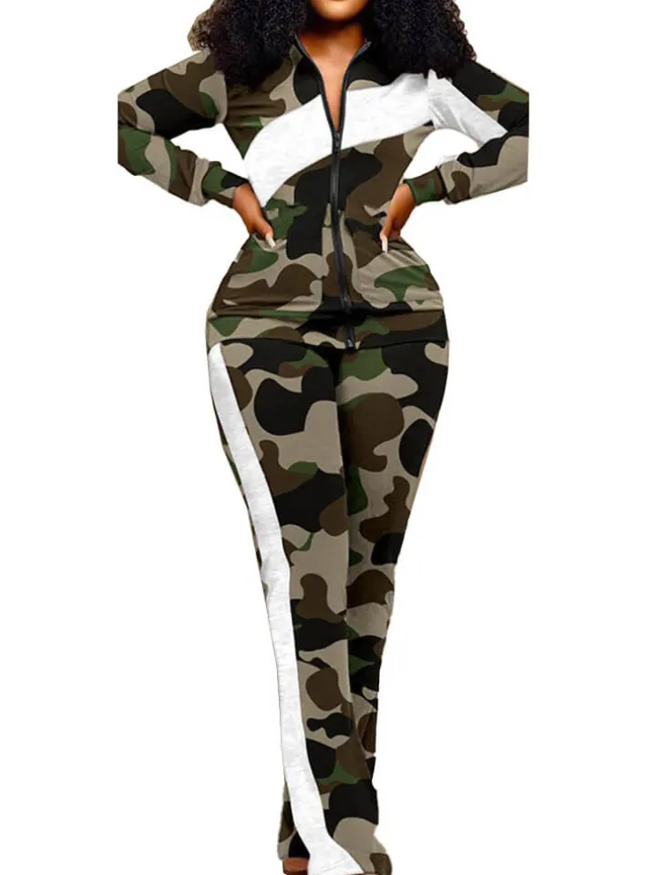 Feature: Geometric, camouflage, leopard, striped, long sleeve, zip up, bodycon, jackets, pants suit, two-piece outfits.