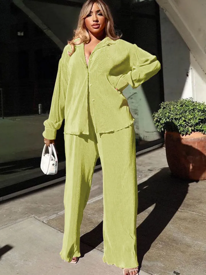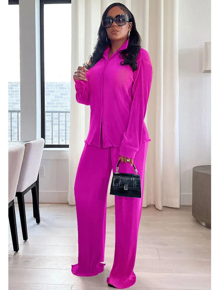 Features: Long sleeve, button down, pleated, shirt, long pants, pant suits, two-piece outfits.