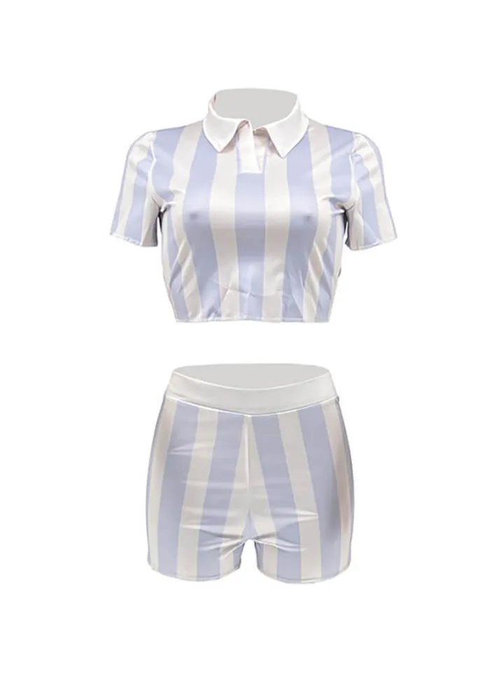 Two Piece Short Sleeve Striped Crop Top Shorts
