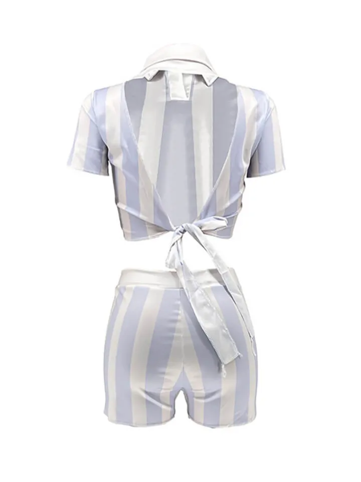 Feature: Short sleeve, striped, color block, backless, tie up, collar, crop top, shorts, bodycon, two-piece outfits.