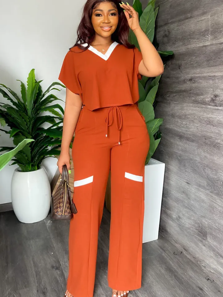 Feature: Patchwork, short sleeve, color block, crop top, drawstring, bodycon, pants suit, two-piece outfits.