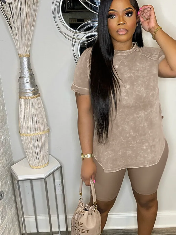 This two-piece short set is crafted from a soft-touch, breathable fabric blend that includes polyester, offering a cool and silky feel akin to ice silk fabric. It stretches for a comfortable fit and features a side split crewneck top paired with high-waisted shorts. Ideal for casual summer, spring, and fall occasions such as beach days, bike rides, and nights out.