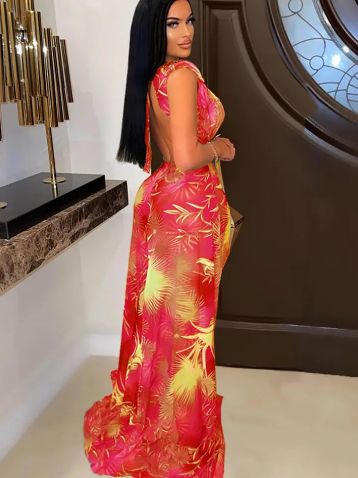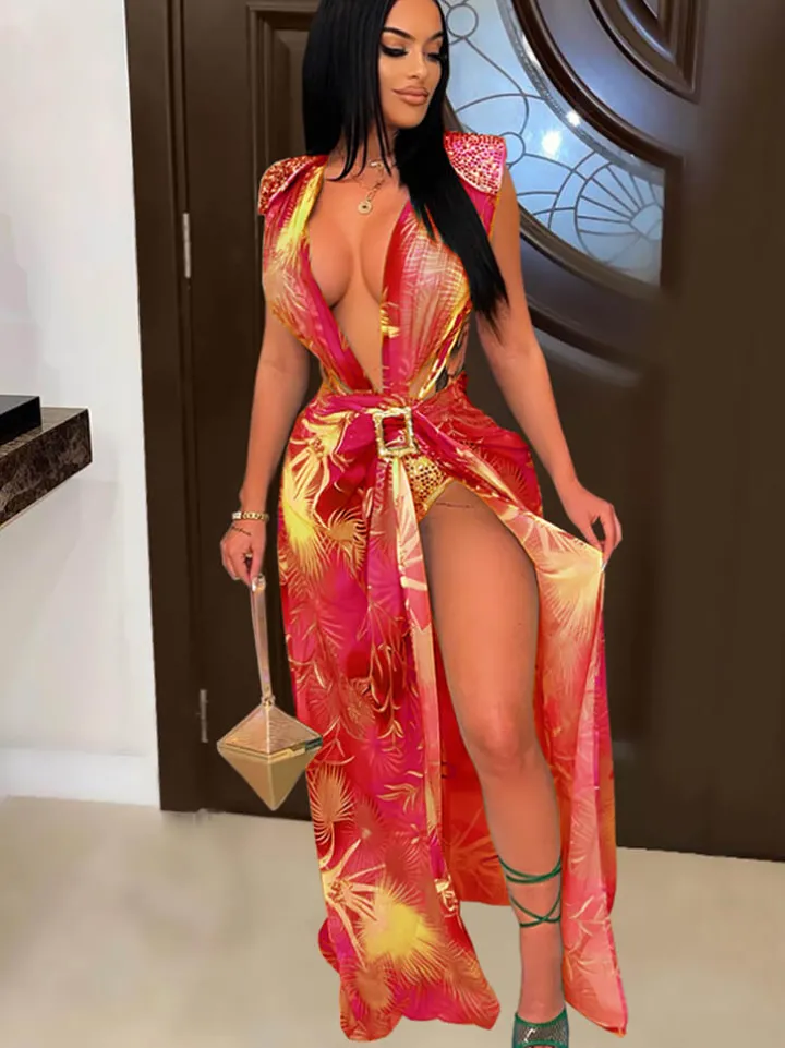 Feature: Sleeveless, floral print, deep v neck, high split, bodycon, romper, swimsuit, maxi skirt, backless, two-piece skirt suits.