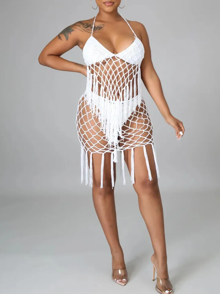 Features: Two-piece outfits, sleeveless, halter, tie-up, backless, bra, tassels, brief.