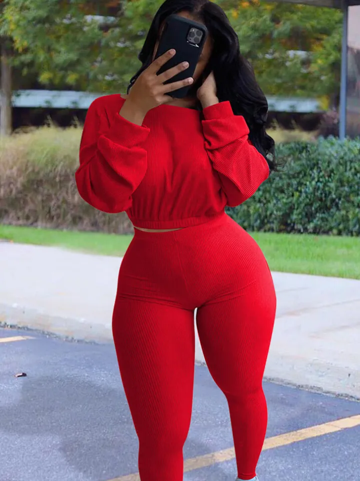Feature: Solid color, ribbed knit tops, and skinny pants.