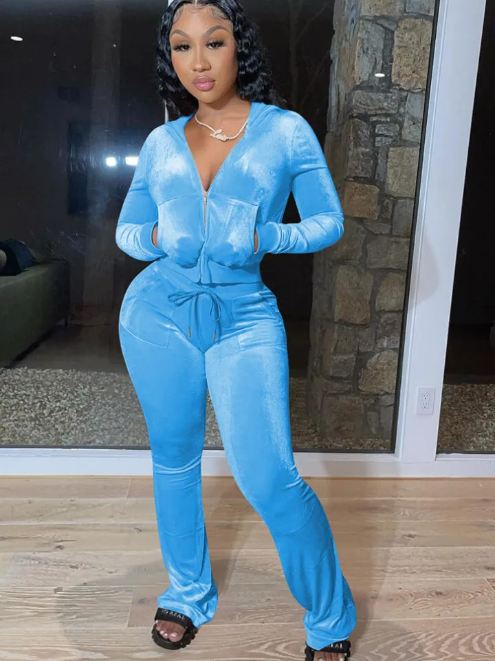 Velour Two Pieces Full Zipper Hooded Tracksuits with Pockets