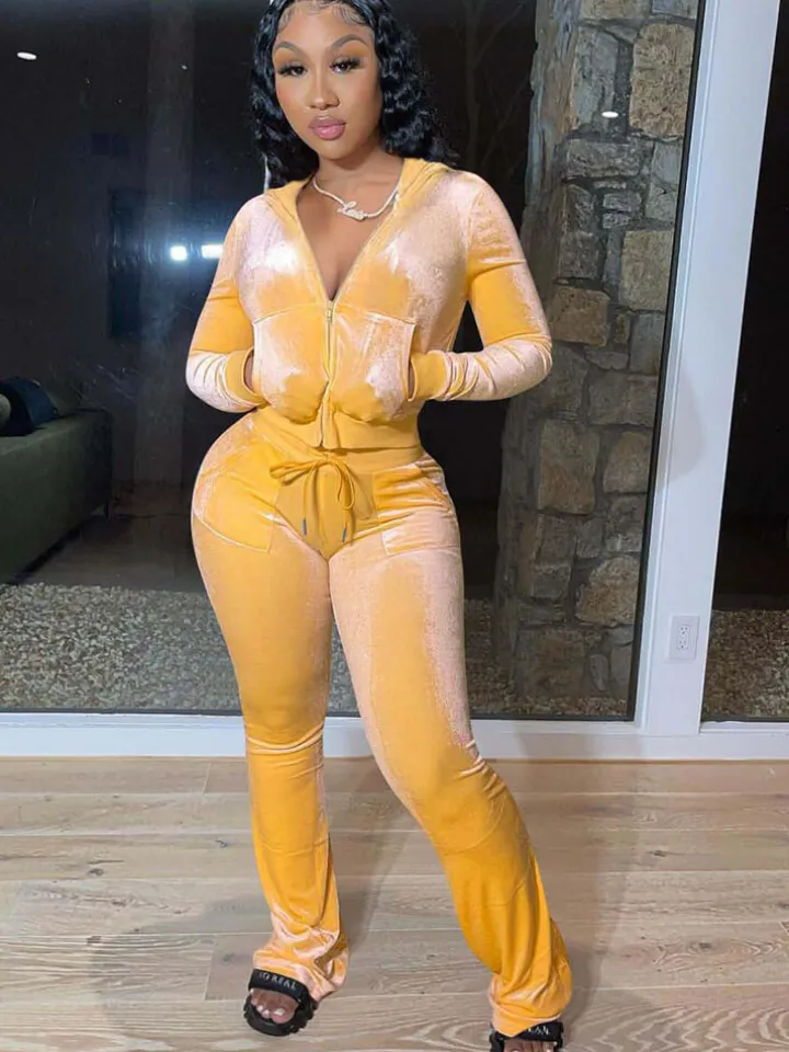 Feature: Velour set, jogging suits, zipper hoodie jacket, drawstring hood, full-zipper closure, long sleeve, solid color, sweatpants women, elastic drawstring adjustable waist, with pockets.