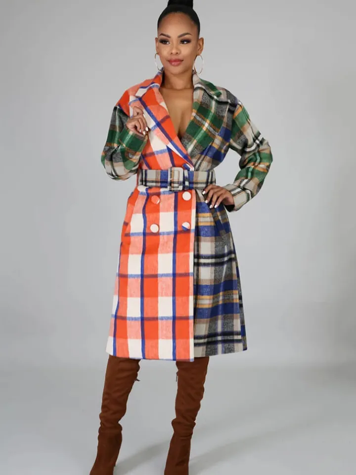 Feature: Plaid print, patchwork, long sleeve, color block, bodycon, printed, long coats, with the belt.